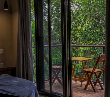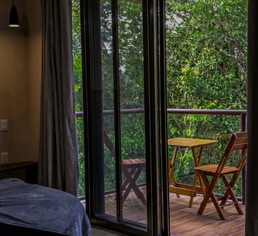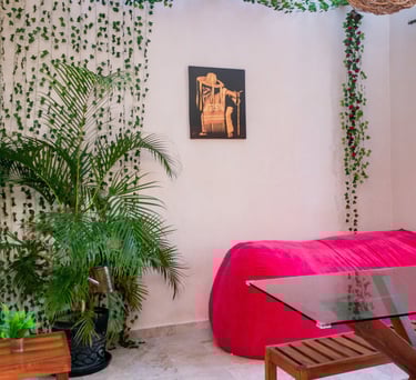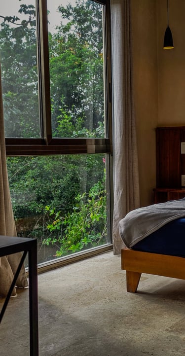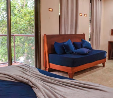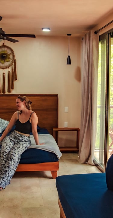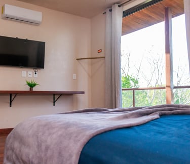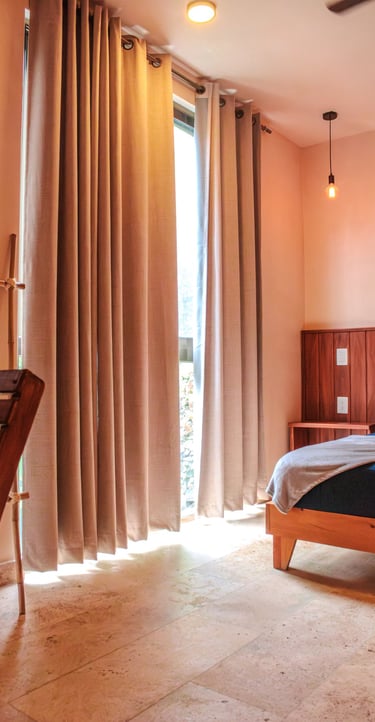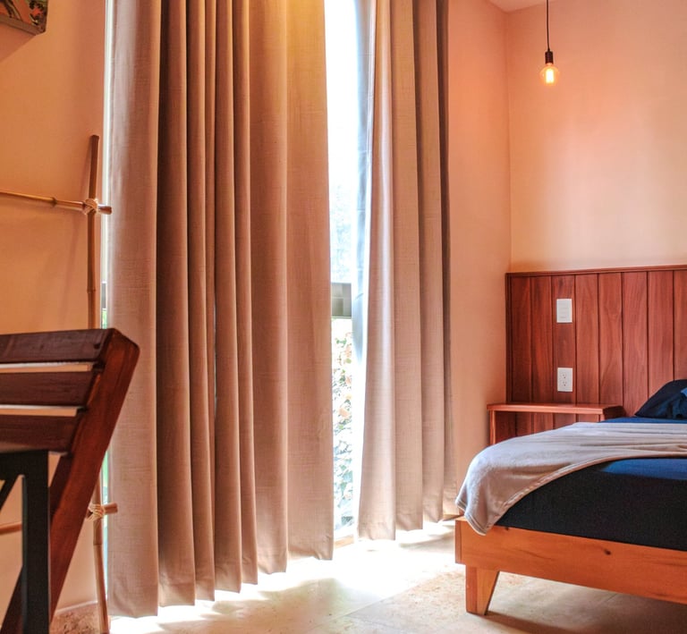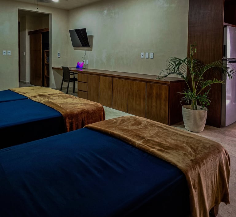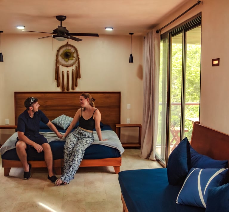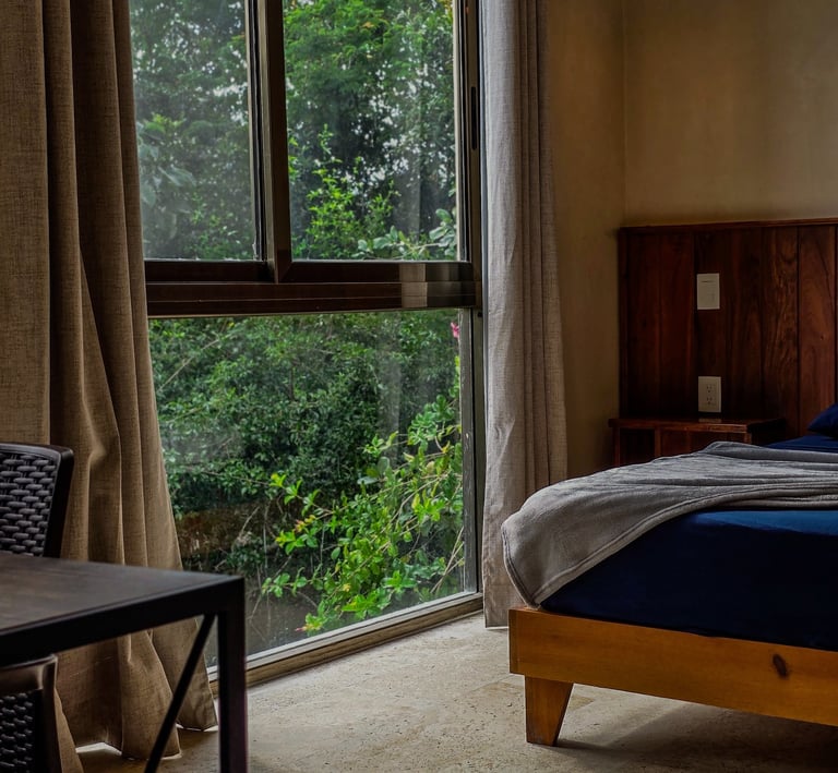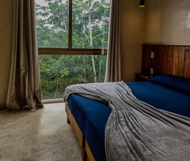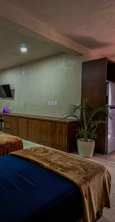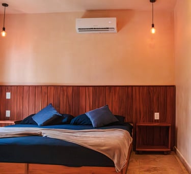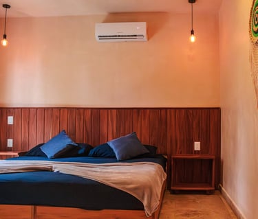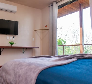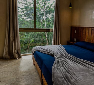 Estancia luminosa con cama king, baño completo, clóset y frigobar; ideal para desconectar o trabajar ligero. Incluye aire acondicionado y Wi-Fi. El conjunto suma alberca en planta baja y en rooftop, jardines y estacionamiento. Además, acceso sin costo a todas las áreas de Ku Kuk Glamping: piscina rooftop, hamacas, área de fogata y pileta tipo cenote con agua caliente para cerrar el día con calma.
