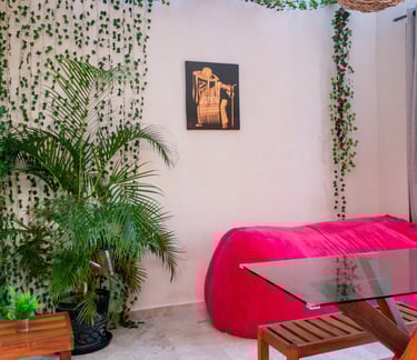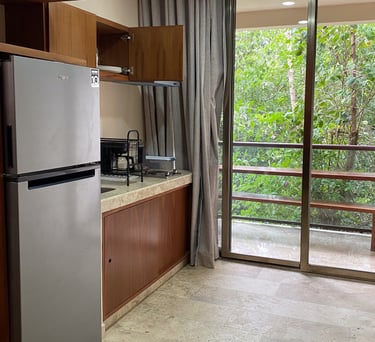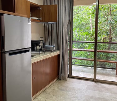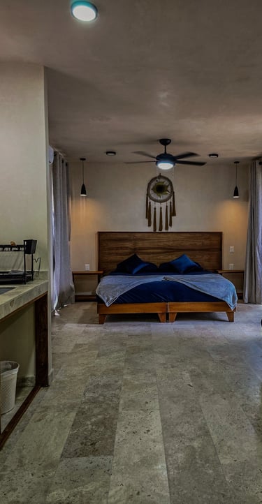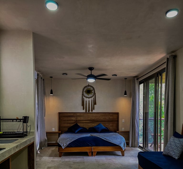 Espacio de planta abierta con cama king, sofá cama, baño completo, cocineta, refrigerador, perfecto para viajes o trabajo remoto. Con aire acondicionado, Wi-Fi, balcón/terraza. El edificio ofrece alberca en planta baja y rooftop, jardines y estacionamiento. También tendrás acceso gratuito a todas las áreas de Ku Kuk Glamping: piscina rooftop, hamacas, fogata y pileta tipo cenote con agua caliente.