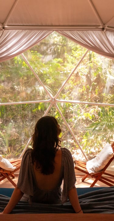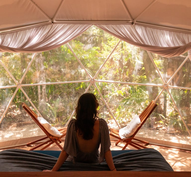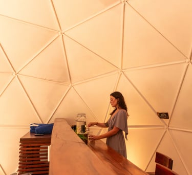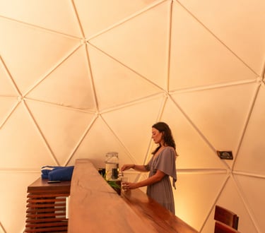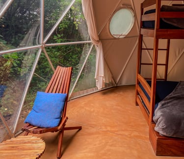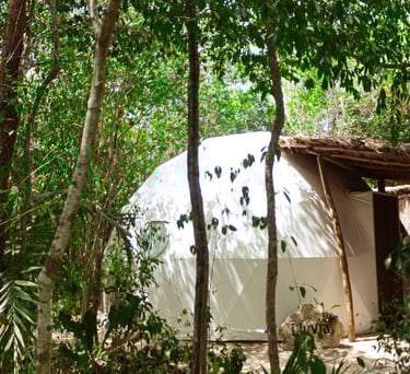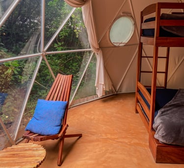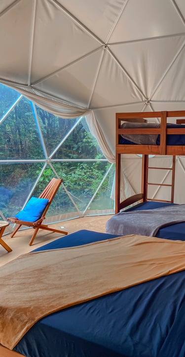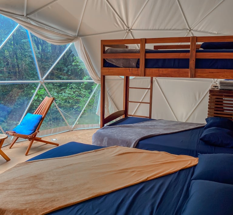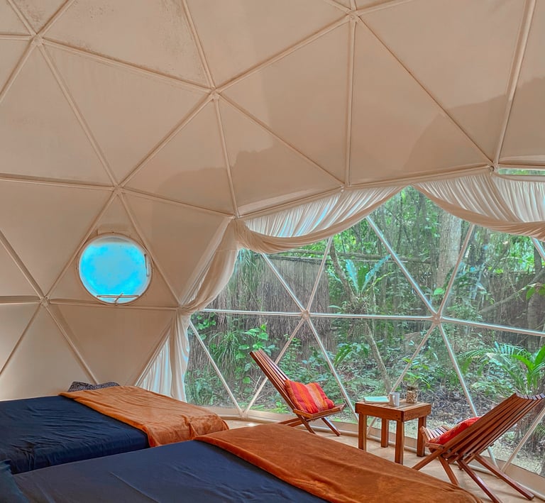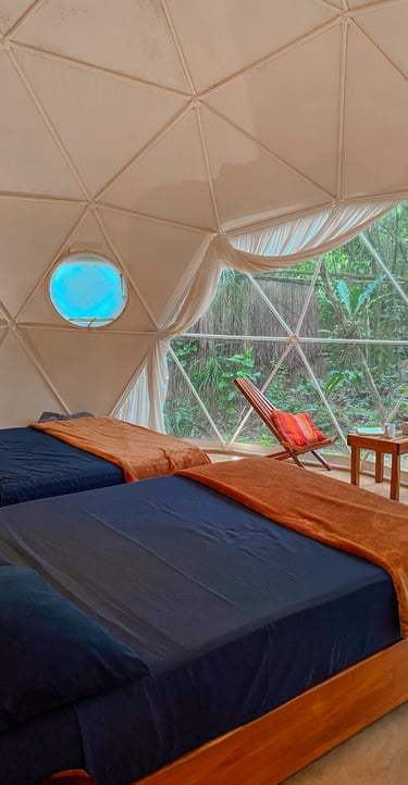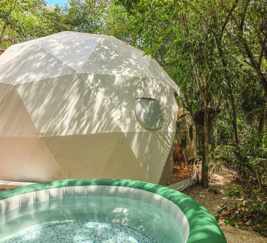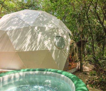 Pensado para compartir sin perder la esencia glamping: espacio amplio con dos camas matrimoniales y baño privado, ambientado en tonos naturales que crean confort inmediato. Tendrás Wi-Fi para trabajar o planear el día y, cuando regreses, te esperan las áreas comunes: piscina rooftop para refrescarte, hamacas para desconectar, fogata bajo estrellas y pileta tipo cenote con agua caliente para cerrar la jornada. La cercanía a cenotes suma planes fáciles cada día y hace de este domo un punto base ideal para familias pequeñas o amigos.