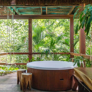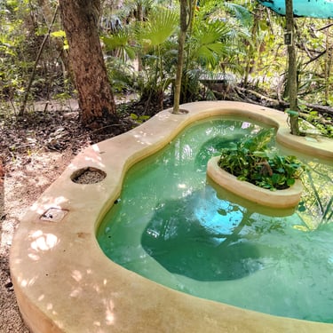 Al volver, disfruten una sesión privada en nuestro jacuzzi tipo cenote, rodeado de vegetación, ideal para relajarse y cerrar el día con total calma.